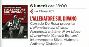 Silvia Alaimo presenta ‘L’allenatore sul divano – psicologia minima di un tifoso di provincia’ di Corrado De Rosa, psichiatra e scrittore salernitano Libreria La Feltrinelli via Etnea 285 – Catania Lunedì 6 marzo 2017 h. 18